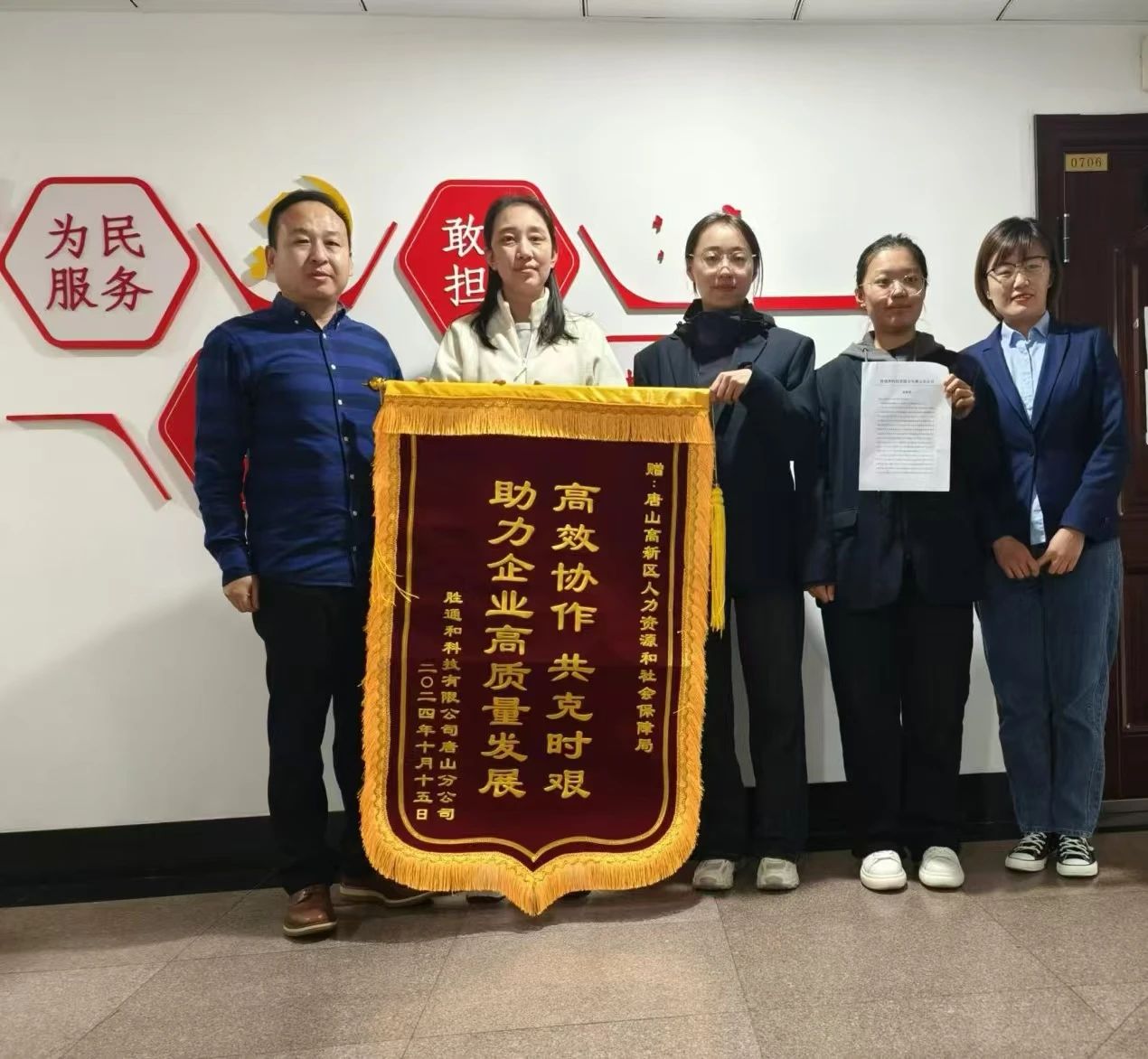 近日,胜通和科技有限公司唐山分公司将一面印有“高效协作 共克时艰 助力企业高质量发展”的锦旗送到高新区人力资源和社会保障局,对高新区人力资源和社会保障局干部职工在劳动关系协调、社会保险服务等领域提供的全方位、无缝隙的支持与服务表达了诚挚感谢。自胜通和科技有限公司唐山分公司入区以来,高新区人力资源和社会保障局深入贯彻落实全省优化营商环境大会精神,按照市委、市政府和党工委、管委会工作部署,坚持以市场主体需求为导向,打造惠企利民的优质营商环境。今年9月,胜通和科技有限公司唐山分公司因公司拓展需要,必须在一周之内完成1000名员工的劳动关系转移和社保缴纳工作。高新区人力资源和社会保障局人才交流服务中心与社会保险服务中心干部职工得知此情况,主动加班加点、牺牲周末休息时间进行系统审批,确保整个转移流程的顺畅进行。同时,为该公司提供了相关政策咨询和指导,保障了转移过程中企业与职工的权益。