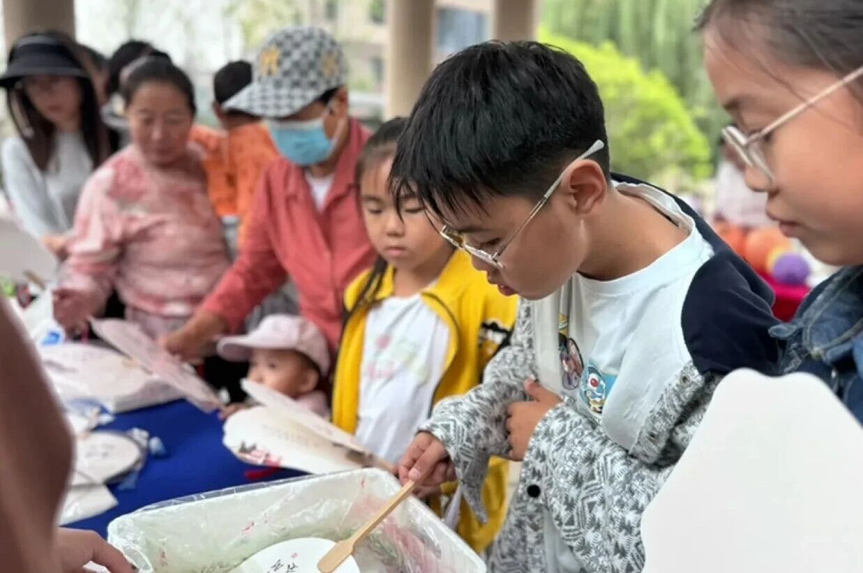 在文昌园社区内,素白的团扇、调好的矿物颜料、剪好的干花穗,整齐地铺在长桌上,居民们或坐或站,手持画笔细细勾勒。小朋友认真涂画着玉兔,年轻夫妻合作绘制“月满西楼”,银发老人以毛笔题下“中秋安康”,随着墨色在扇面上缓缓晕开,中秋的诗意与邻里的情谊就此相融。