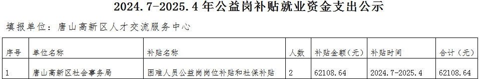 根据河北省财政厅、河北省人力资源和社会保障厅关于印发《河北省就业创业资金管理办法》的通知(冀财规〔2018〕21号)规定,通过公益性岗位安置就业困难人员并缴纳社会保险费的单位,按其为就业困难人员实际缴纳的基本养老保险费、基本医疗保险费(含生育保险费)、失业保险费和工伤保险费给予补贴,不包括就业困难人员个人应缴纳的部分。岗位补贴标准最高不超过当地最低工资标准。经审核,唐山高新技术产业开发区社会事务局申报2名公益性岗位就业困难人员2024年7月-2025年4月社保补贴22508.64元、2024年7月-2025年4月岗位补贴39600元;合计需从就业补助资金列支62108.64元。现将补贴情况进行公示,公示时间为2025年10月22日至2025年10月26日。