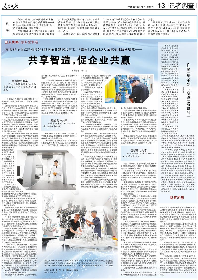 截至目前,河北省89个重点产业集群168家企业建成共享工厂(载体),开放生产制造、研发设计、检验检测等资源,共享设备1万余台(套),带动1.3万余家企业协同增效。