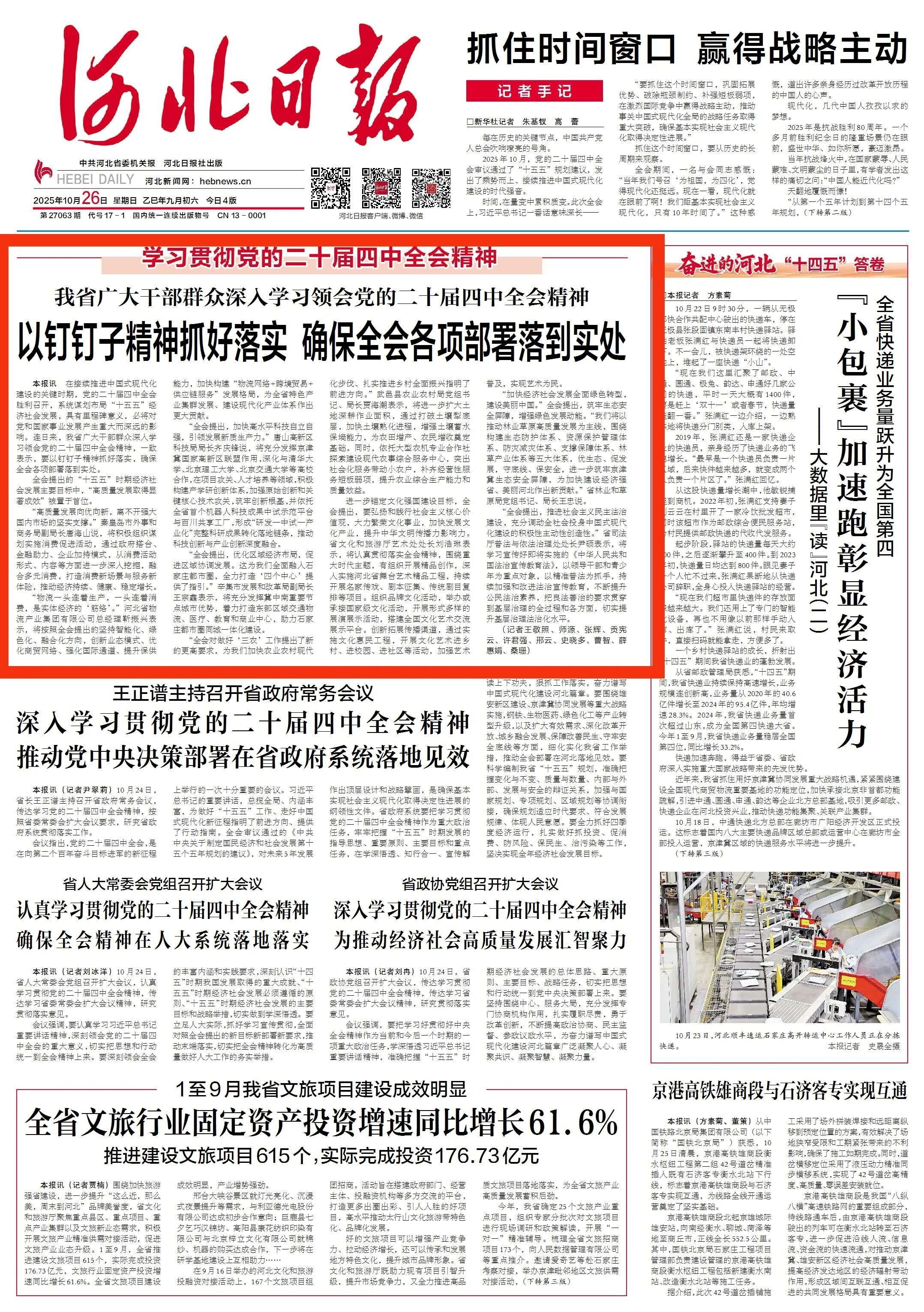 河北日报客户端讯 在接续推进中国式现代化建设的关键时期,党的二十届四中全会胜利召开,系统谋划布局“十五五”经济社会发展,具有里程碑意义,必将对党和国家事业发展产生重大而深远的影响。连日来,我省广大干部群众深入学习领会党的二十届四中全会精神,一致表示,要以钉钉子精神抓好落实,确保全会各项部署落到实处。
