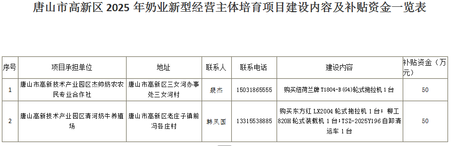 按照《高新区2025年奶业新型经营主体培育项目实施方案》要求,我区现有杰帅、清河2家奶牛养殖企业完成项目建设内容,经验收合格。现将项目单位建设内容及补贴资金向社会进行公示,公示期自2025年10月28日至2025年10月30日,公示3天。如对以上公示结果有异议,请以电话形式将意见反映至高新区动物检疫疫病防控中心。联系电话:0315-5518119。