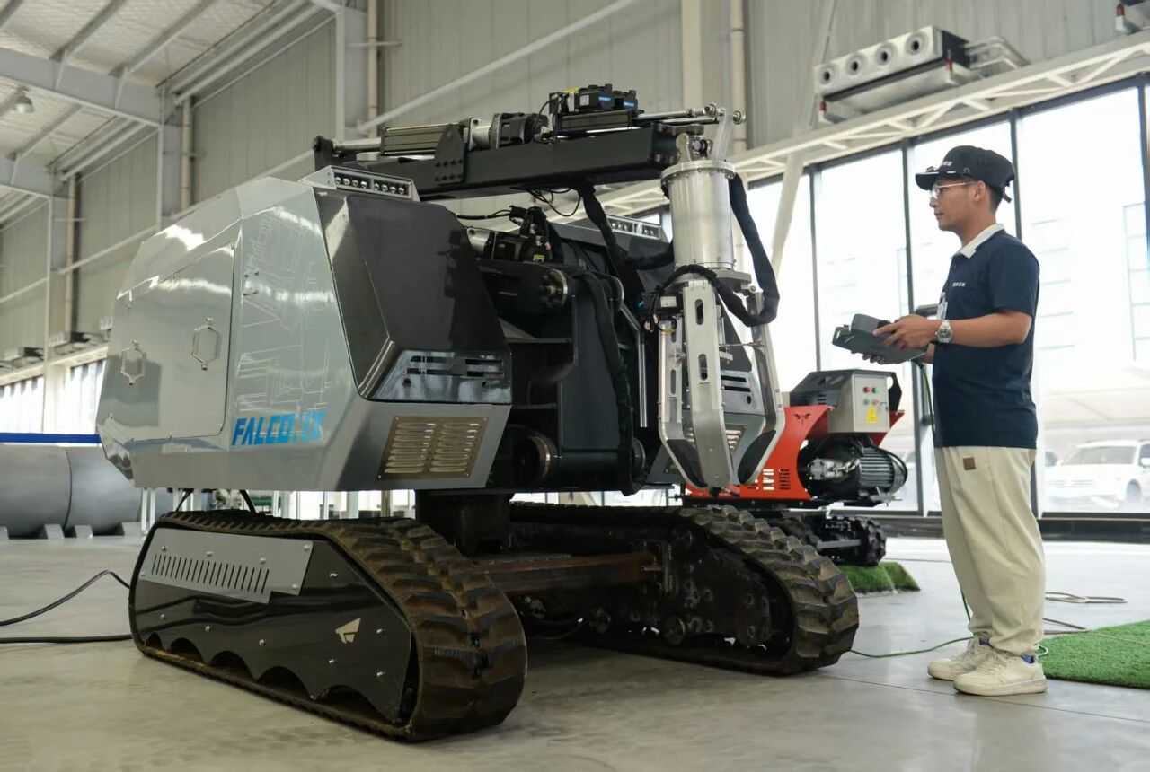 唐山鹰眼智能科技有限公司工作人员进行操作特种机器人 图/杜雯拓摄