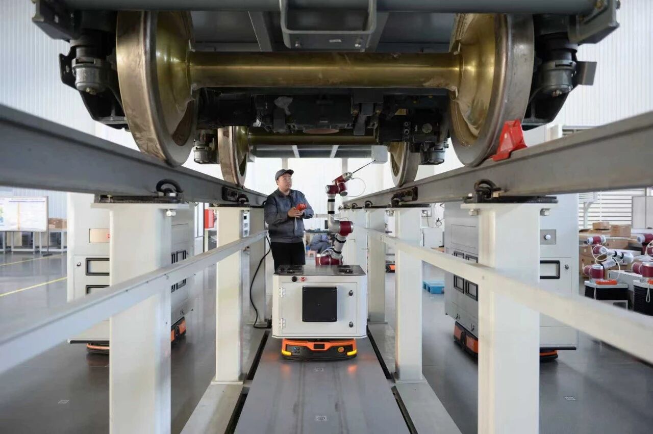 唐山百川机器人共享制造工厂内技术工人正在调试车底吹扫机器人 图/吕泽宣摄