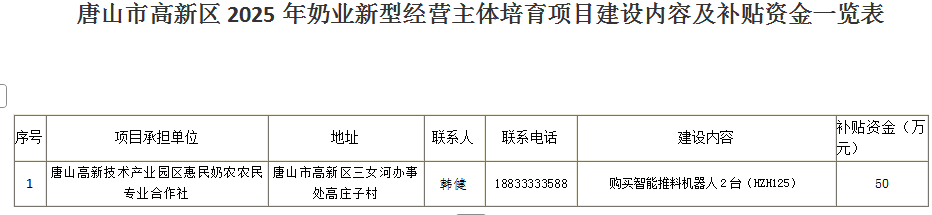 按照《高新区2025年奶业新型经营主体培育项目实施方案》要求,我区现有惠民1家奶牛养殖企业完成项目建设内容,经验收合格。现将项目单位建设内容及补贴资金向社会进行公示,公示期自2025年11月4日至2025年11月6日,公示3天。如对以上公示结果有异议,请以电话形式将意见反映至高新区动物检疫疫病防控中心。联系电话:0315-5518119。