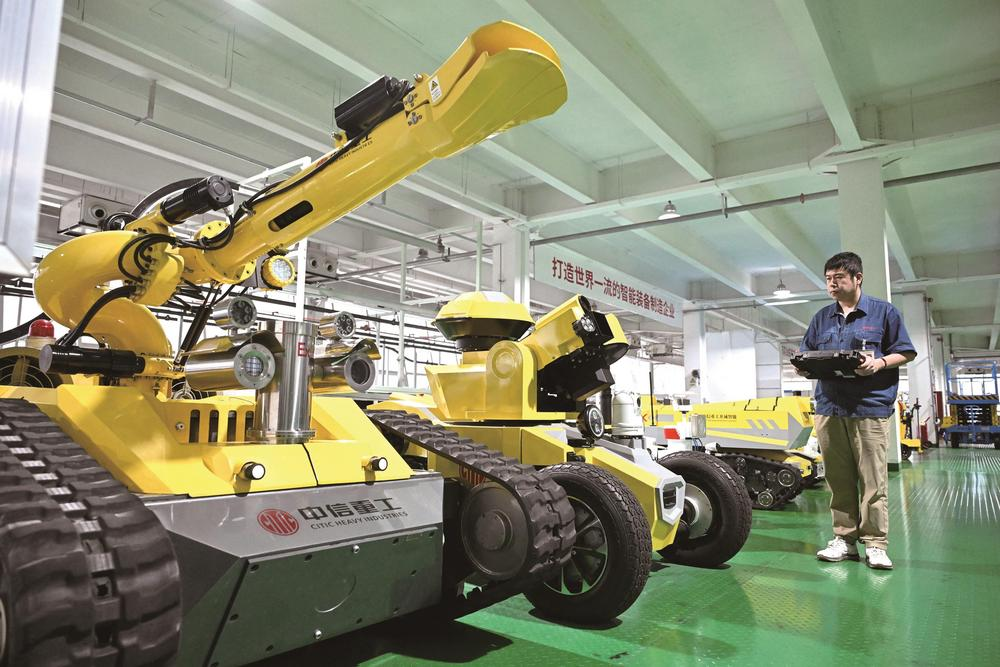 中信重工开诚智能装备有限公司技术人员调试消防机器人产品。