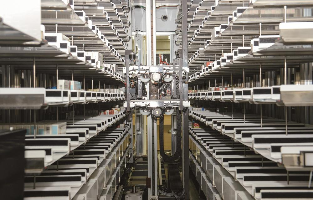 晟群科技一体化全药品机器人在智慧药房里取药。