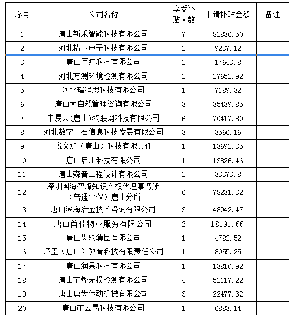 根据《唐山市人力资源和社会保障局、唐山市财政局关于印发<唐山市就业补助资金管理办法>的通知》(唐财规〔2019〕1号)规定。对招用毕业2年内的高校毕业生,与之签订1年以上劳动合同并为其缴纳社会保险费的中小微企业,按其为高校毕业生实际缴纳的基本养老保险费、基本医疗保险费、失业保险费和工伤保险费,给予相应劳动合同期限但最长不超过3年的社会保险补贴,不包括高校毕业生个人应缴纳的部分。唐山新禾智能科技有限公司等20家企业申报的中小微企业吸纳高校毕业生社保补贴共计568367.9元,符合政策要求。现予以公示,公示日期为2025年11月19日至2025年11月21日。如对公示中的内容存在异议,请在公示期内反馈高新区人力资源和社会保障局人才交流服务中心。