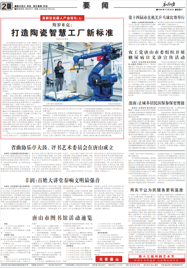 “目前针对唐山市场开发的‘装窑’机器人,即将进入设备生产阶段;与高压电瓷厂合作开发的高压电瓷棒型绝缘子切割系统已小批量投入使用。” 吕宣儒说,未来,斯罗米克将继续深耕陶瓷智能装备领域,加快设备迭代升级,为唐山陶瓷产业向绿色化、高端化、智能化、融合化发展贡献力量。