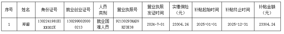 根据《唐山市人力资源和社会保障局、唐山市财政局关于印发<唐山市就业补助资金管理办法>的通知》(唐财规〔2019〕1号)规定:初次创业人员的社会保险补贴,毕业5年内的高校毕业生、就业困难人员和去产能企业失业人员,初次创业领取营业执照(包括从事个体经营或创办小微企业和在民政部门注册的社会组织,除国家限定行业外,下同)、登记就业、正常经营6个月以上且缴纳社会保险费的,按实际缴纳的社会保险费给予补贴,补贴期限最长不超过3年。每人只能享受一次,以上符合条件灵活就业人员和初次创业人员社会保险补贴的缴费基数最高不超过社会平均工资。现将补贴情况进行公示,公示日期为2025年12月4日至2025年12月8日,待公示到期后发放至个人账户,监督电话:5776176。