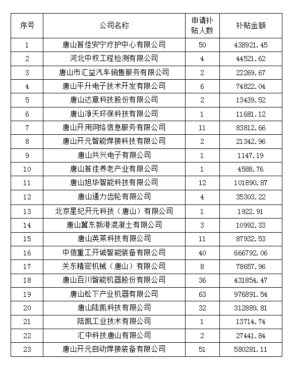 根据《唐山市人力资源和社会保障局、唐山市财政局关于印发<唐山市就业补助资金管理办法>的通知》(唐财规〔2019〕1号)规定。对招用毕业2年内的高校毕业生,与之签订1年以上劳动合同并为其缴纳社会保险费的中小微企业,按其为高校毕业生实际缴纳的基本养老保险费、基本医疗保险费、失业保险费和工伤保险费,给予相应劳动合同期限但最长不超过3年的社会保险补贴,不包括高校毕业生个人应缴纳的部分。唐山首佳安宁疗护中心有限公司等23家企业申报的中小微企业吸纳高校毕业生社保补贴共计4043112.38元,符合政策要求。现予以公示,公示日期为2025年12月22日至2025年12月24日。如对公示中的内容存在异议,请在公示期内反馈高新区人力资源和社会保障局人才交流服务中心。