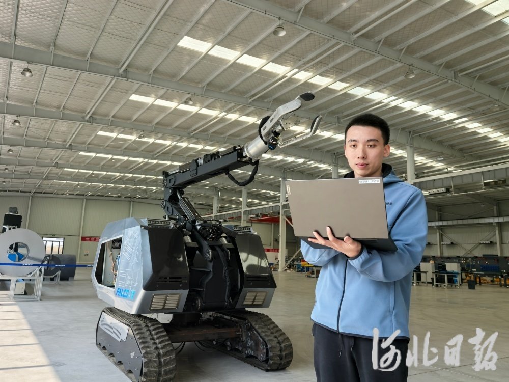 日前,河北鹰眼智能科技集团有限公司董事长袁鵾在调试特种机器人。赵琦摄