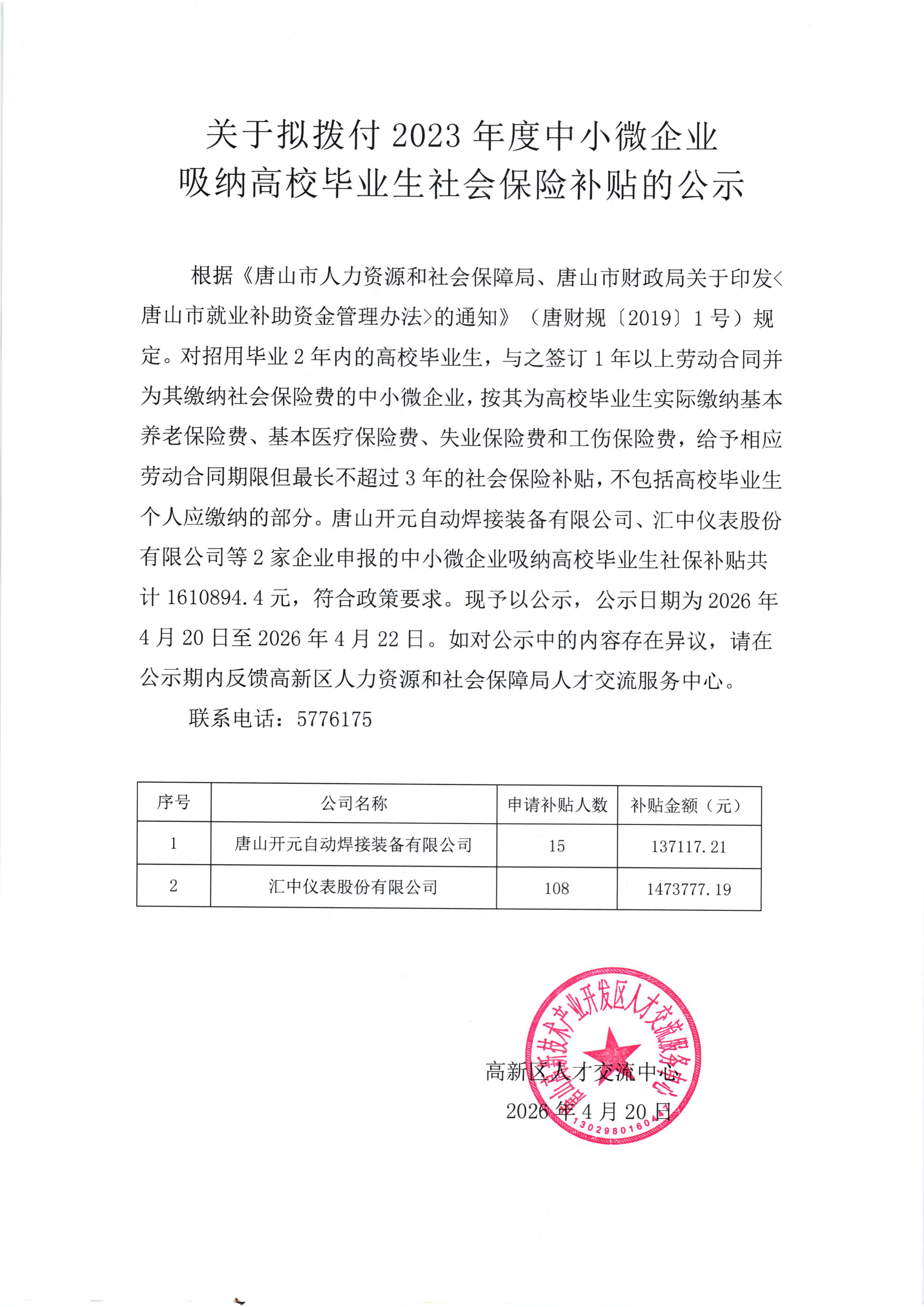 关于拟拨付2023年度中小微企业吸纳高校毕业生社会保险补贴的公示