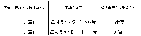 根据《不动产登记暂行条例实施细则》第十四条的规定,经初步查验,不动产登记机构拟对下列不动产权利办理不动产继承登记。根据《不动产登记暂行条例实施细则》第十七条的规定,现予公告。如有异议,请自本公告之日起90个工作日内,将异议书面材料送达不动产登记机构。逾期无人提出异议或者异议不成立的,不动产登记机构将予以登记。