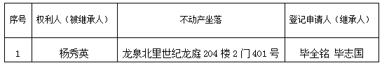 根据《不动产登记暂行条例实施细则》第十四条的规定,经初步查验,不动产登记机构拟对下列不动产权利办理不动产继承登记。根据《不动产登记暂行条例实施细则》第十七条的规定,现予公告。如有异议,请自本公告之日起90个工作日内,将异议书面材料送达不动产登记机构。逾期无人提出异议或者异议不成立的,不动产登记机构将予以登记。