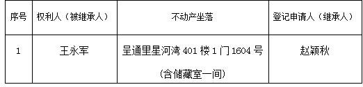 根据《不动产登记暂行条例实施细则》第十四条的规定,经初步查验,不动产登记机构拟对下列不动产权利办理不动产继承登记。根据《不动产登记暂行条例实施细则》第十七条的规定,现予公告。如有异议,请自本公告之日起90个工作日内,将异议书面材料送达不动产登记机构。逾期无人提出异议或者异议不成立的,不动产登记机构将予以登记。