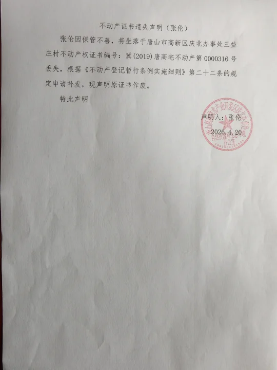 不动产证书遗失声明(张伦)
